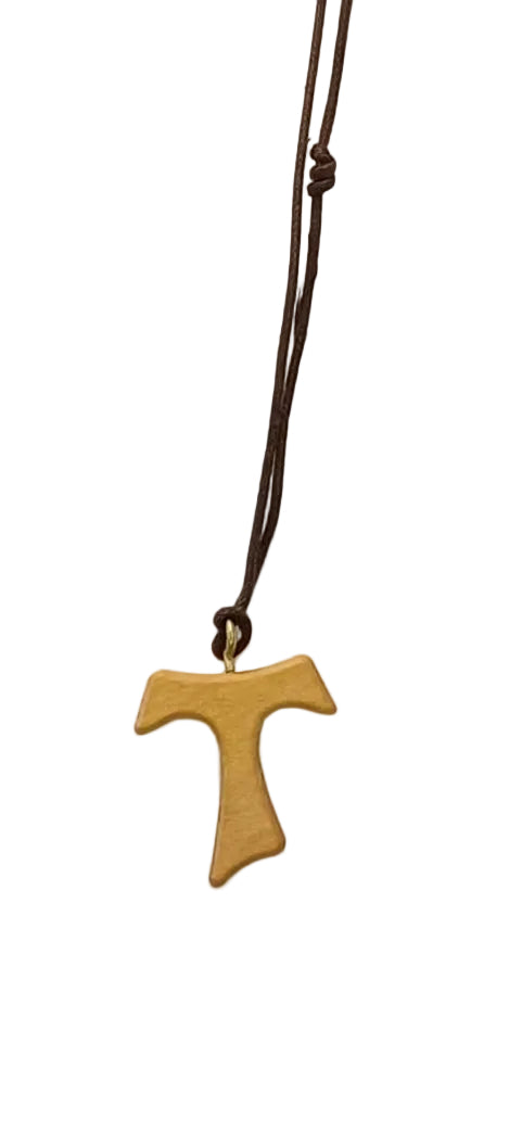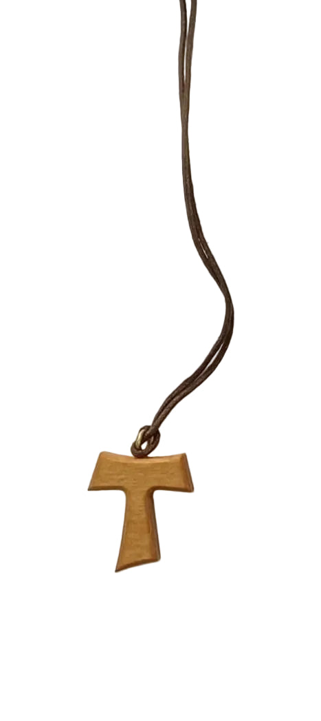 Tau in legno d'ulivo con cordoncino marrone. Lunghezza laccetto cm 35 Dimensioni tau cm 2,5x2...