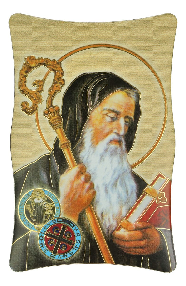 Quadretto smussato con immagine di San Benedetto da Norcia e dettagli oro a caldo Dimensioni:...