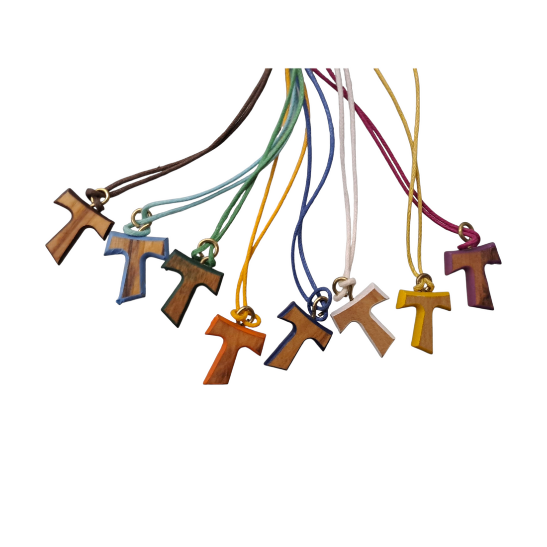 Tau in legno di ulivo con bordi di vari colori completo di collana in corda...