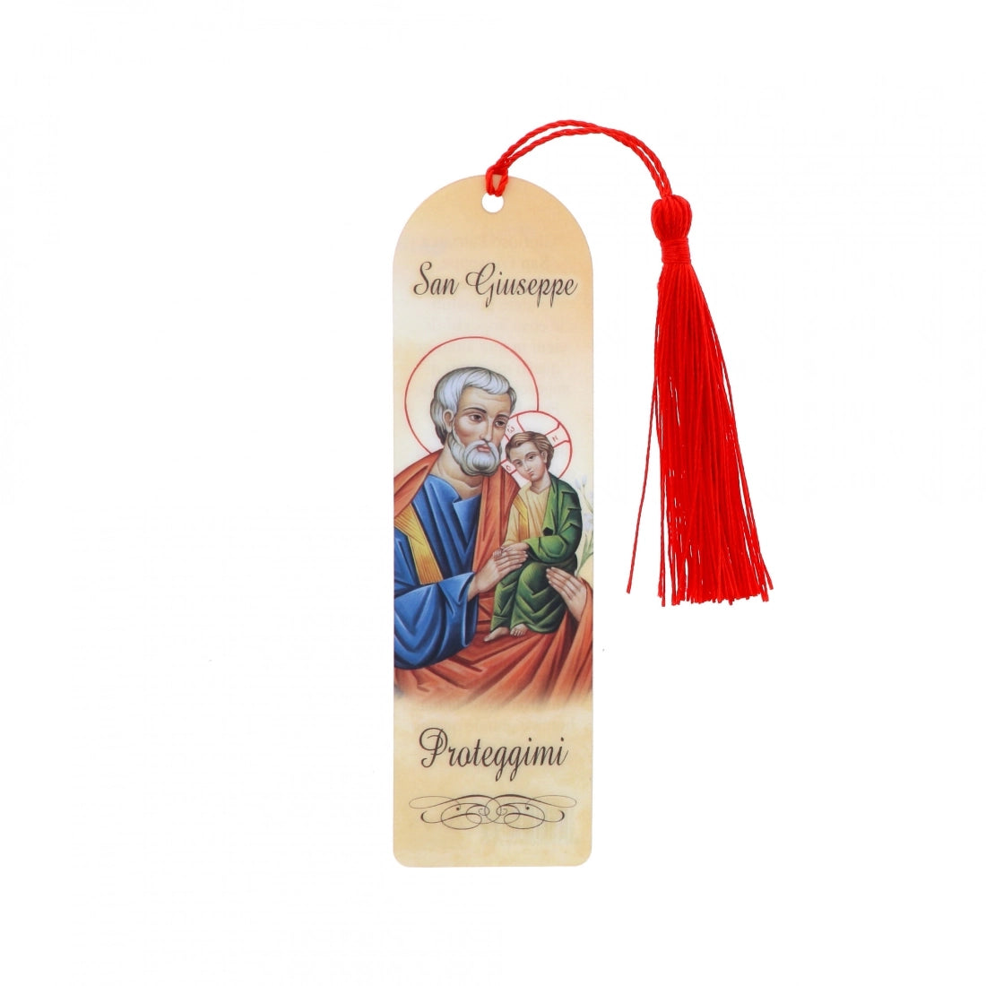 Segnalibro plastificato con nappina avorio raffigurante San Giuseppe e preghiera sul retro Dimensione segnalibro: 14x4...