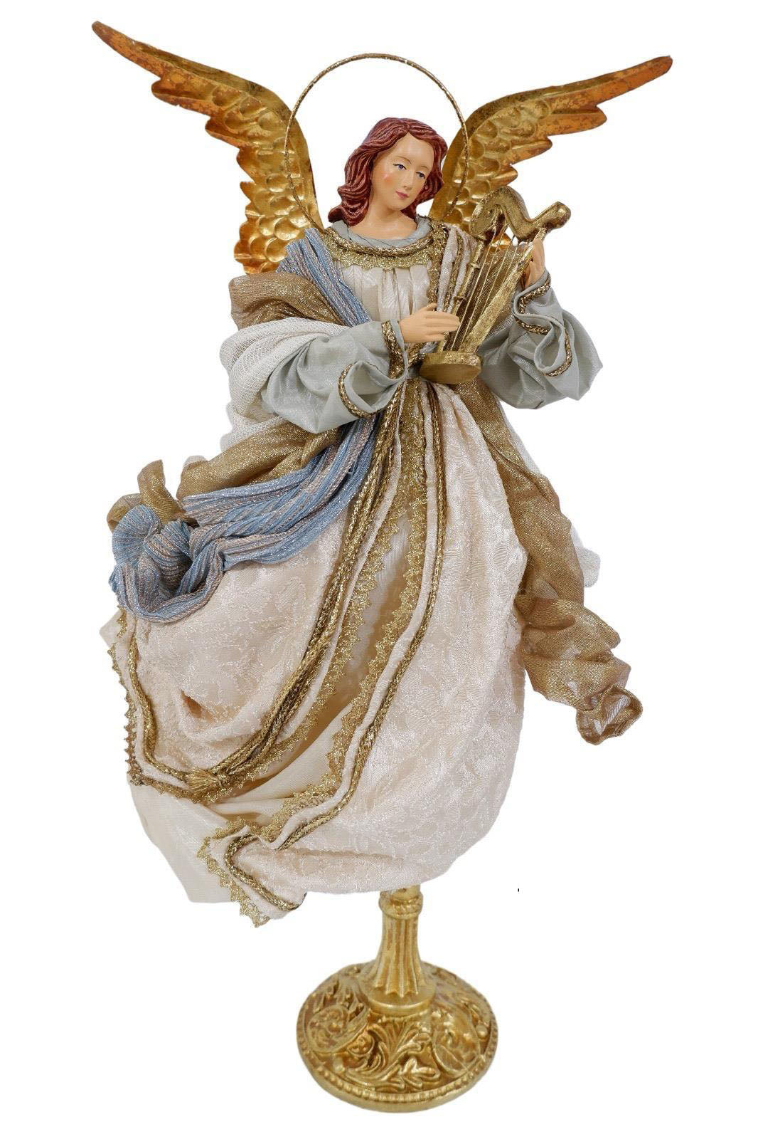 Angelo in resina e stoffa su base dorata, con dettagli colore oro, ali metallo dorato, aureola e arpa.