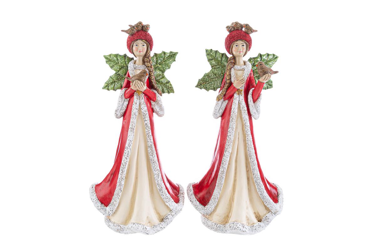 Angeli in resina natalizi con dettagli di agrifoglio e uccellini
