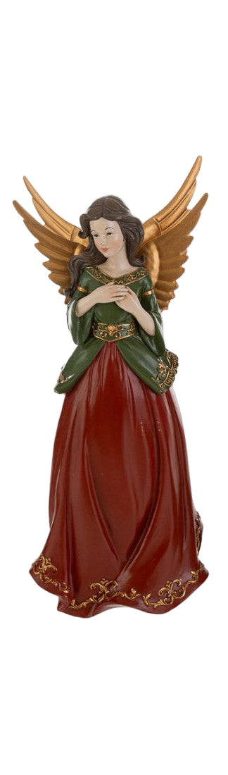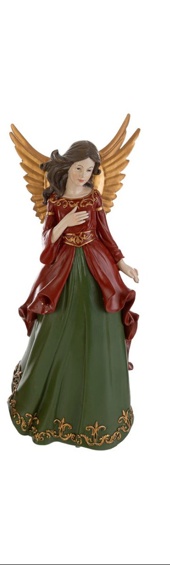 Angelo in resina colori natalizi e dettagli oro, disponibile in due varianti