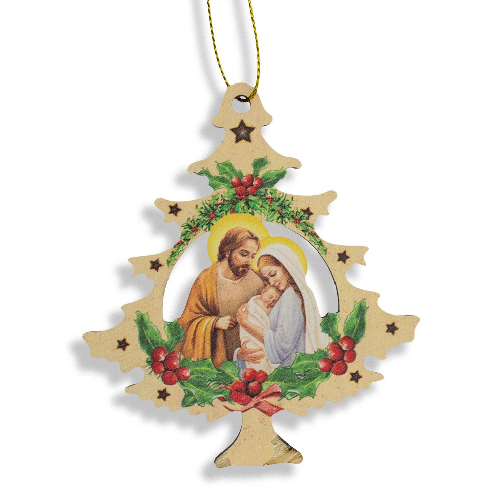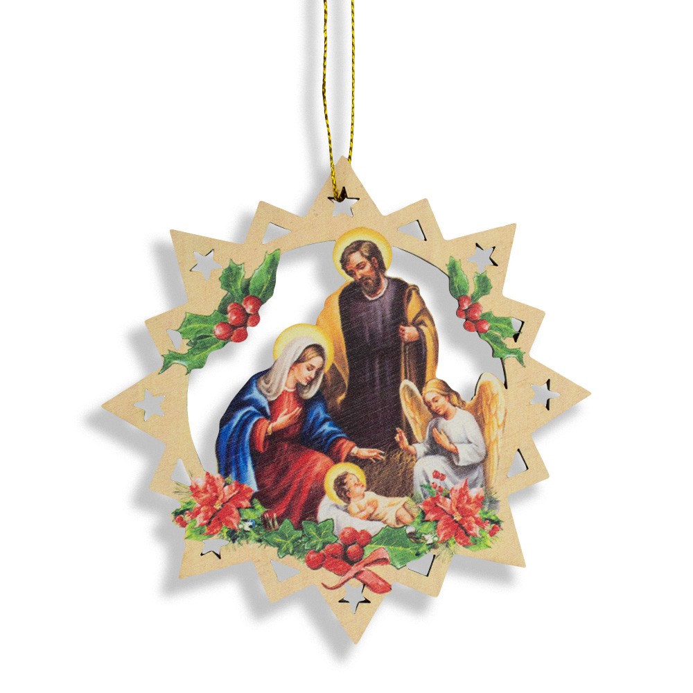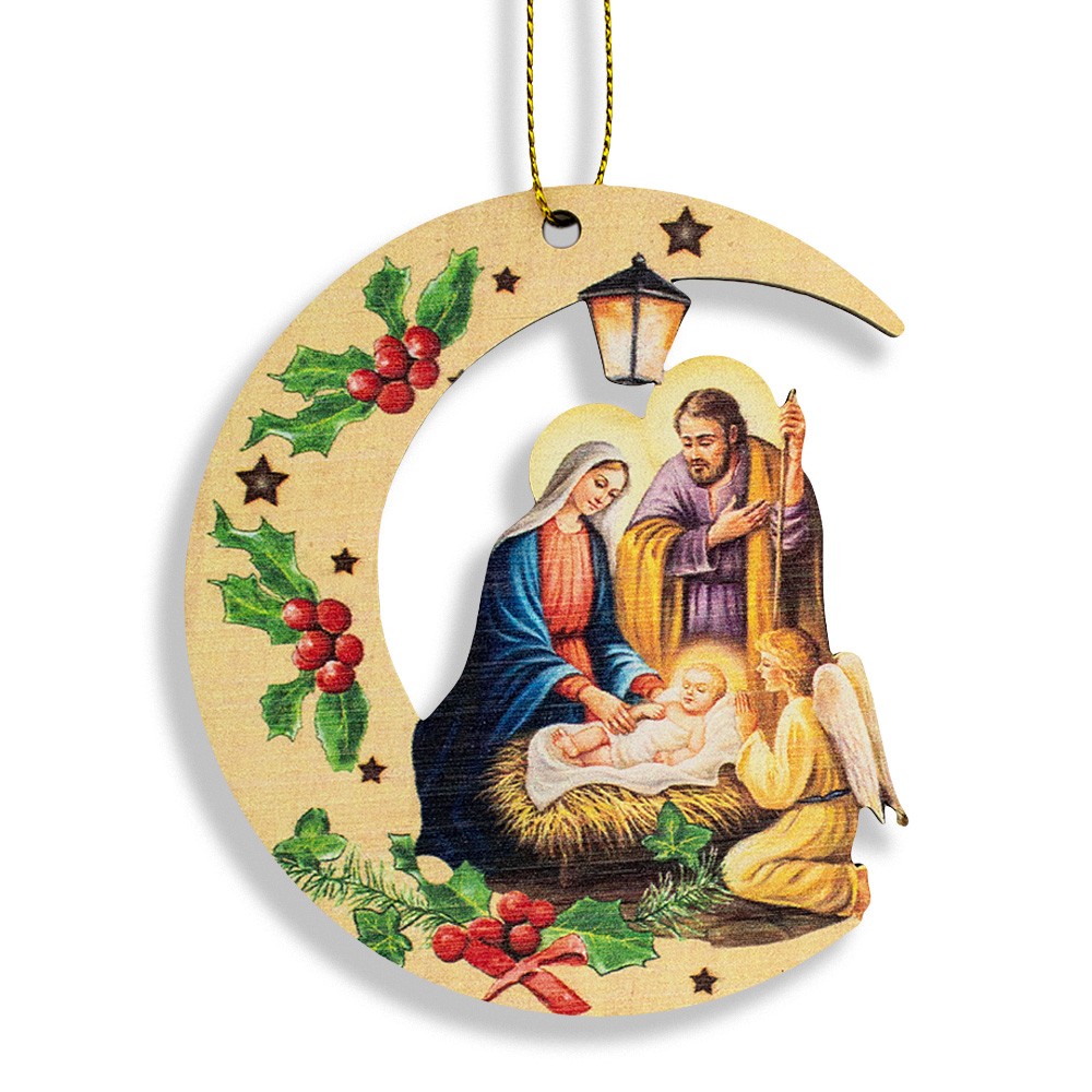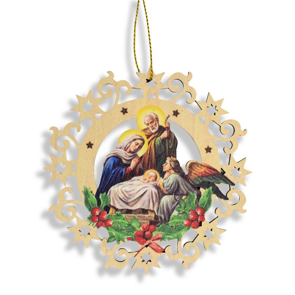 Addobbo natalizio in legno traforato e stampato in cinque varianti di soggetto raffigurante la natività e confezionato in elegante cartoncino.
