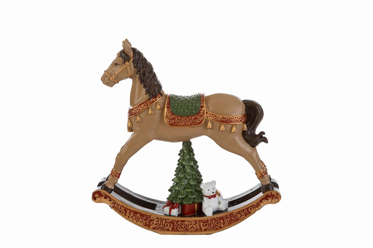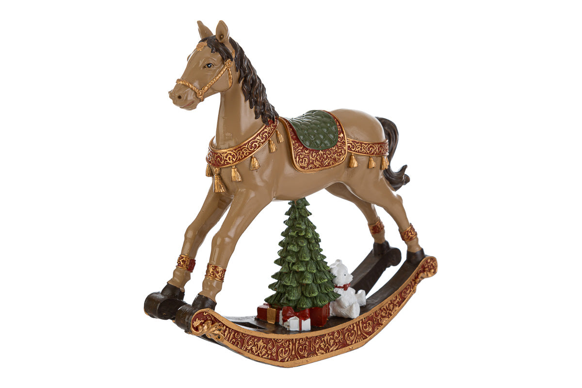 Cavallo a dondolo in resina con dettagli oro con soggetti natalizi