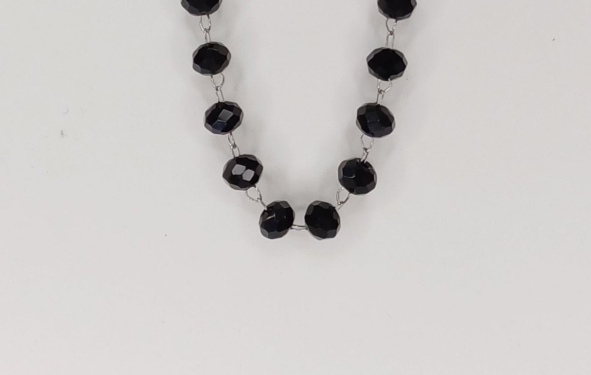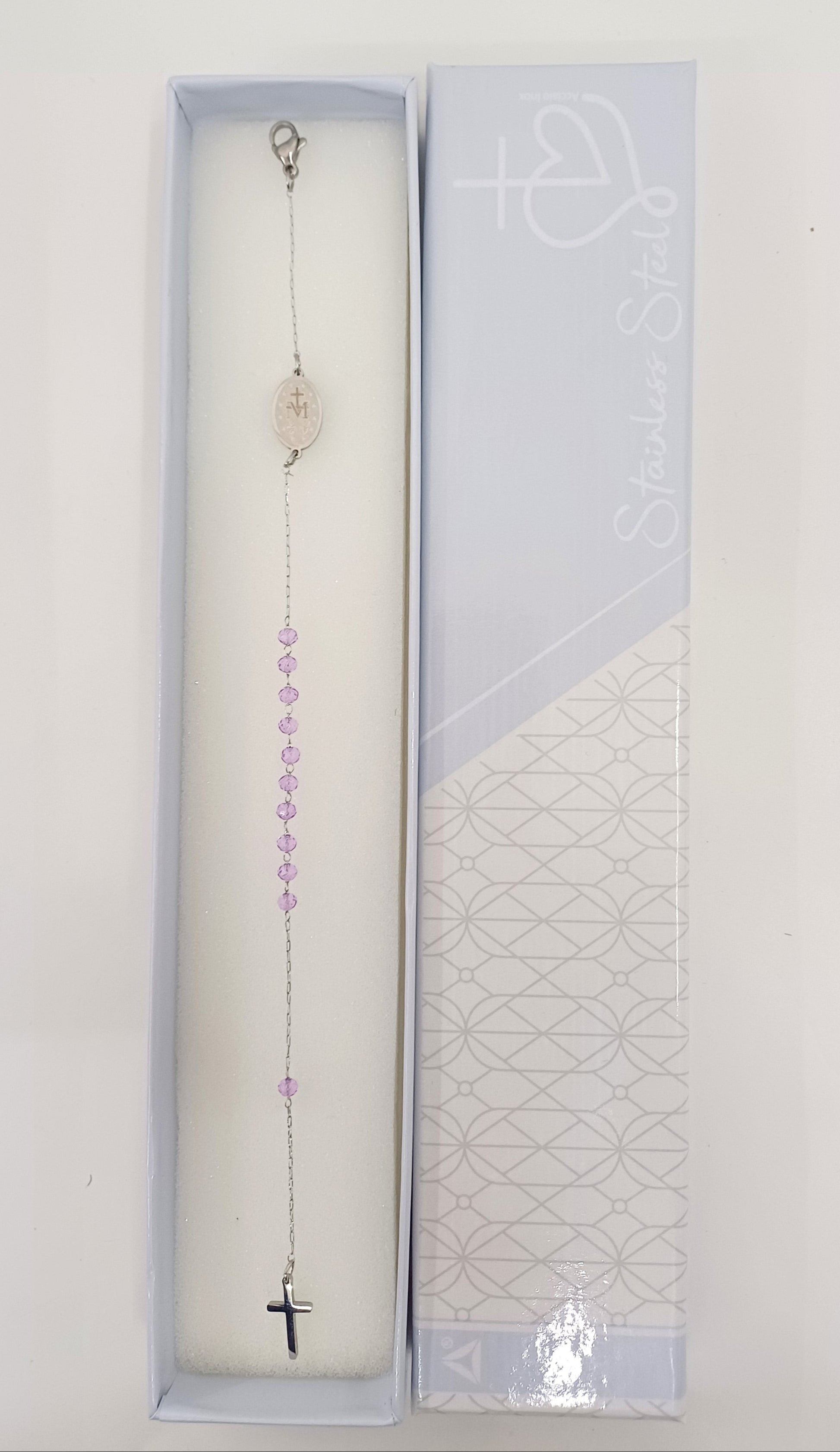 Bracciale acciaio, grani in cristalli sfaccettati e colorati, con crocetta e medaglina miracolosa, disponibile in 10 varianti di colore