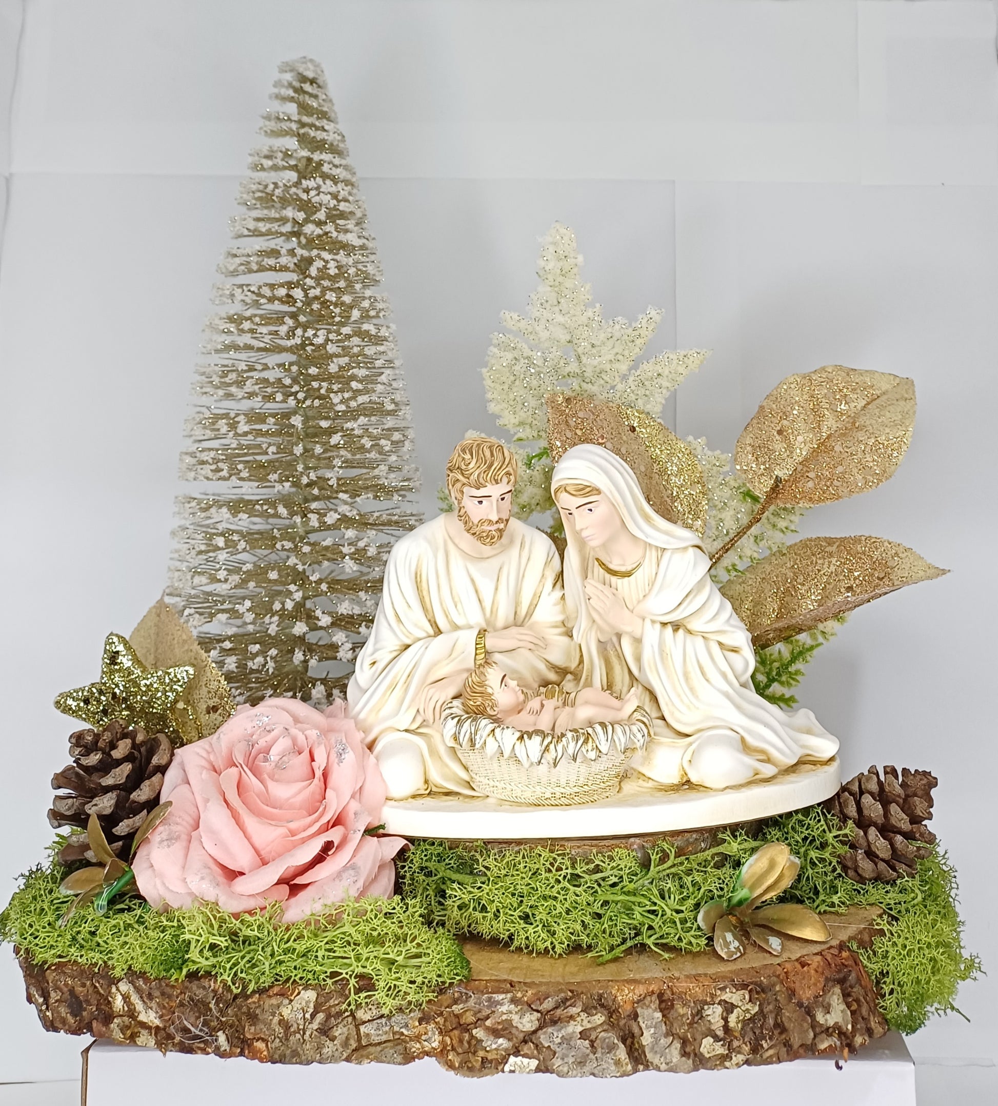 Natività in resina su base legno naturale, decorata a tema natalizio. Ottima idea regalo come centrotavola per le festività