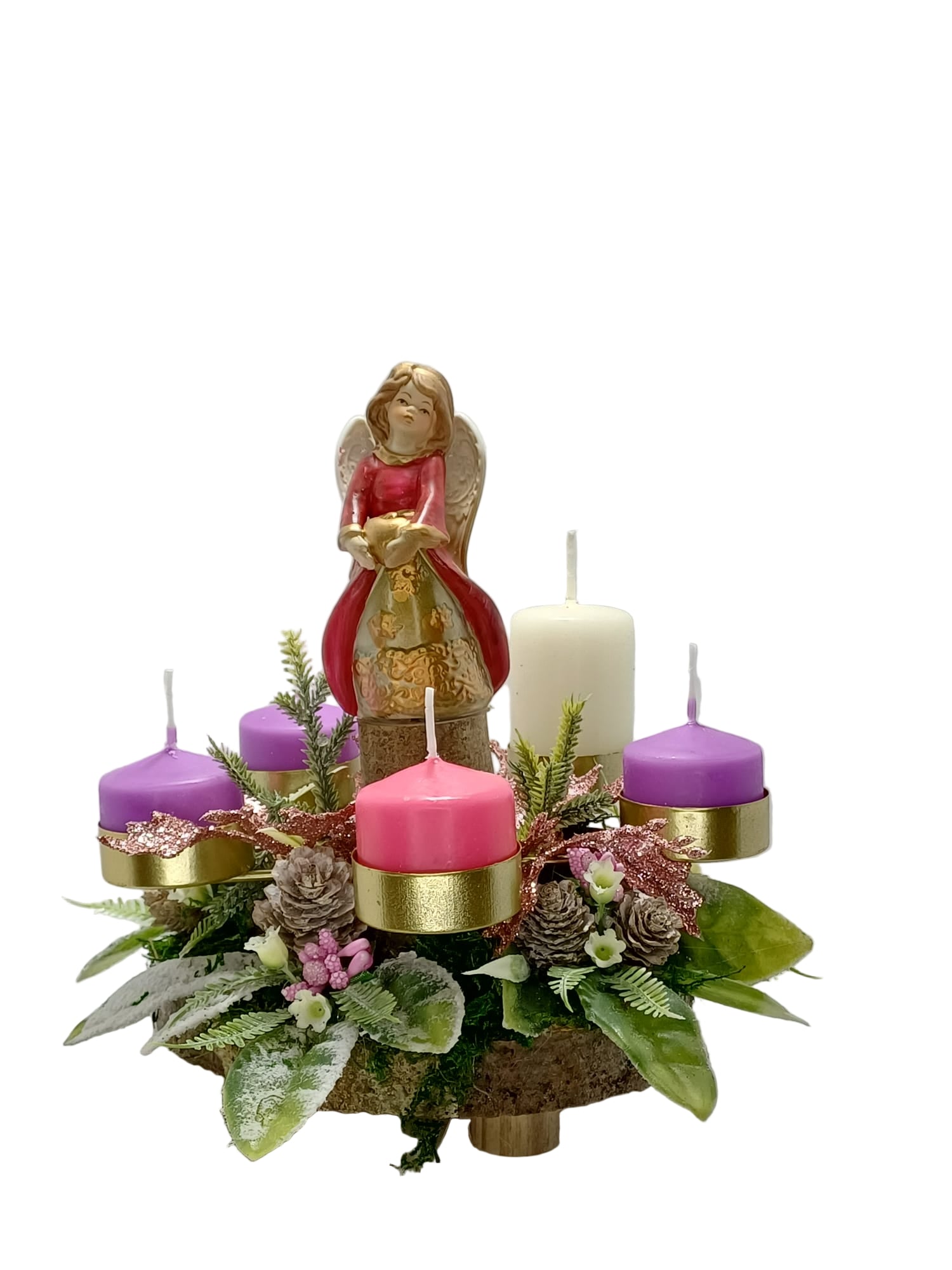 Corona in legno naturale e decori sintetici con angelo cuore. Gli alloggi dei moccoli di cera sono metallici di color oro in modo da prevenire colatura di cera e inneschi di fiamma. Viene fornita con una proposta di preghiera su cartoncino da recitare in famiglia per le domeniche d'Avvento. Articolo da regalo ideale anche come centro tavola.