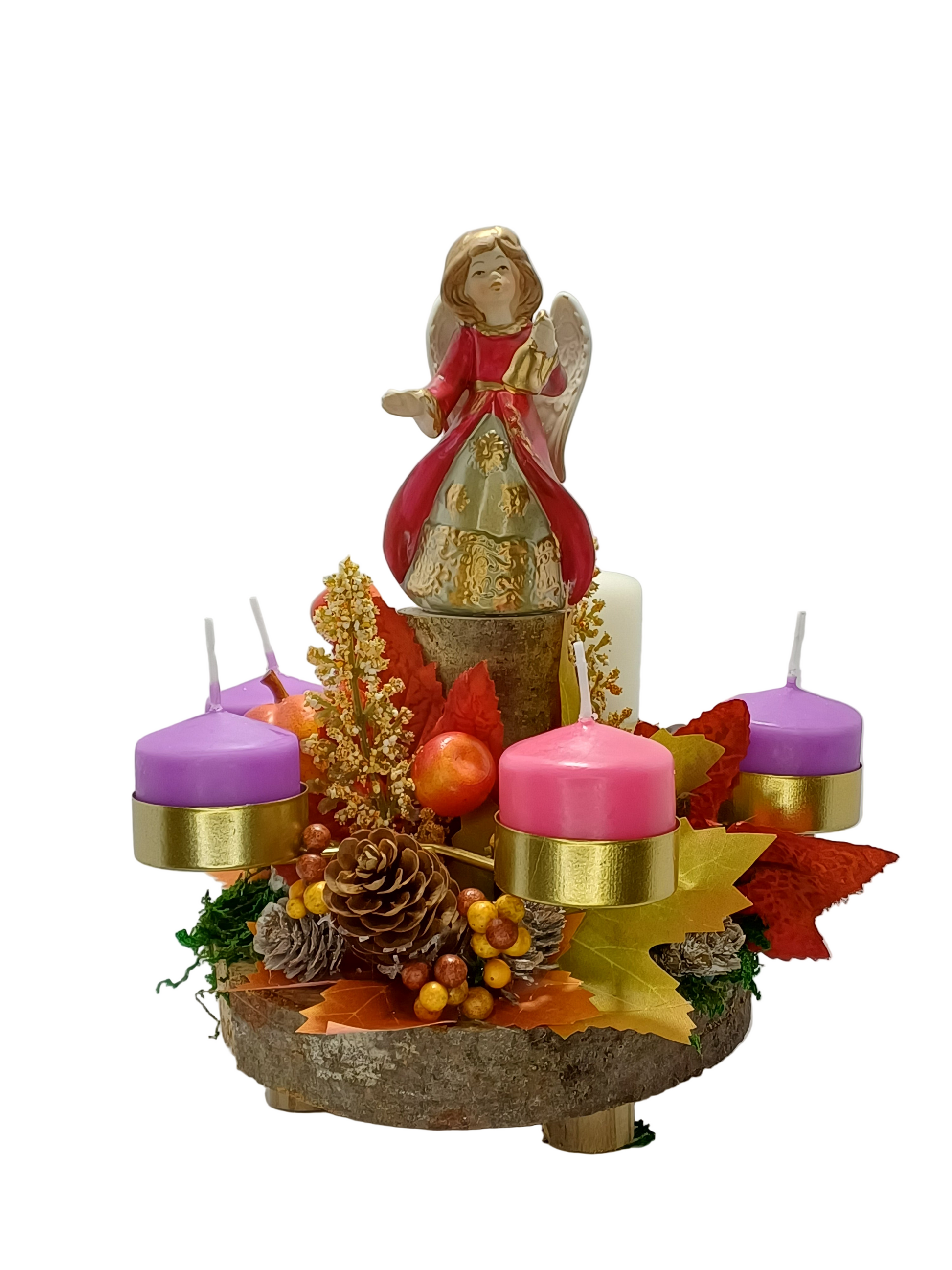 Corona in legno naturale e decori sintetici con angelo e campana. Gli alloggi dei moccoli di cera sono metallici di color oro in modo da prevenire colatura di cera e inneschi di fiamma. Viene fornita con una proposta di preghiera su cartoncino da recitare in famiglia per le domeniche d'Avvento. Articolo da regalo ideale anche come centro tavola.