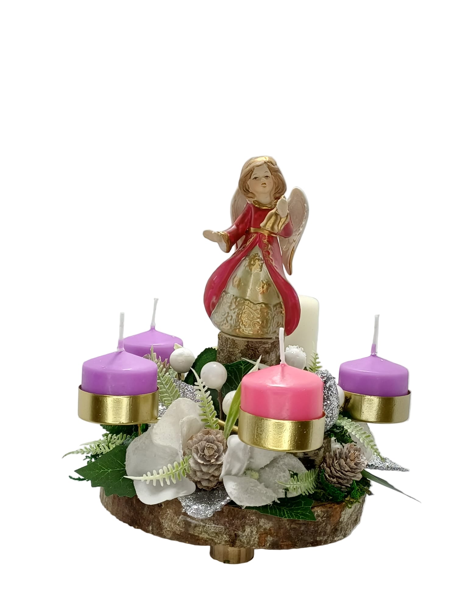 Corona in legno naturale e decori sintetici con angelo e campana. Gli alloggi dei moccoli di cera sono metallici di color oro in modo da prevenire colatura di cera e inneschi di fiamma. Viene fornita con una proposta di preghiera su cartoncino da recitare in famiglia per le domeniche d'Avvento. Articolo da regalo ideale anche come centro tavola.