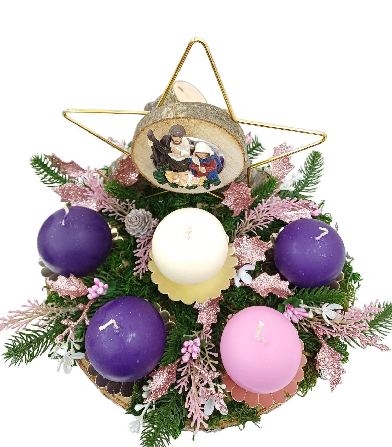 Corona in legno naturale con calamita natività in resina removibile, stella in metallo, e decori sintetici. Gli alloggi delle piccole candele colorate sono metallici, in modo da prevenire colature di cera e inneschi di fiamma. Viene fornita con una proposta di preghiera su cartoncino da recitare in famiglia per le domenica d'Avvento con l'aggiunta di una quinta candela per il giorno di Natale