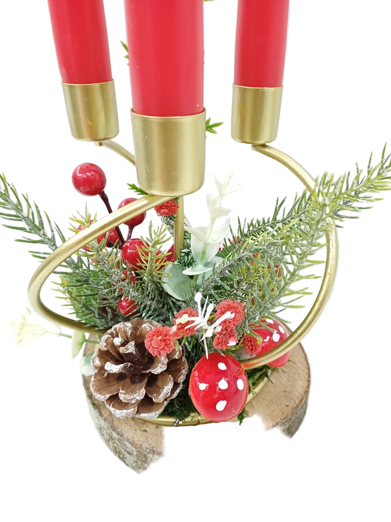 Corona in metallo color oro su supporto in legno naturale con decori sintetici. Gli alloggi di color oro sono metallici su di un unico supporto circolare per prevenire colature di cera e inneschi di fiamma. Viene fornita con una proposta di preghiera su cartoncino da recitare in famiglia per le domeniche di Avvento.