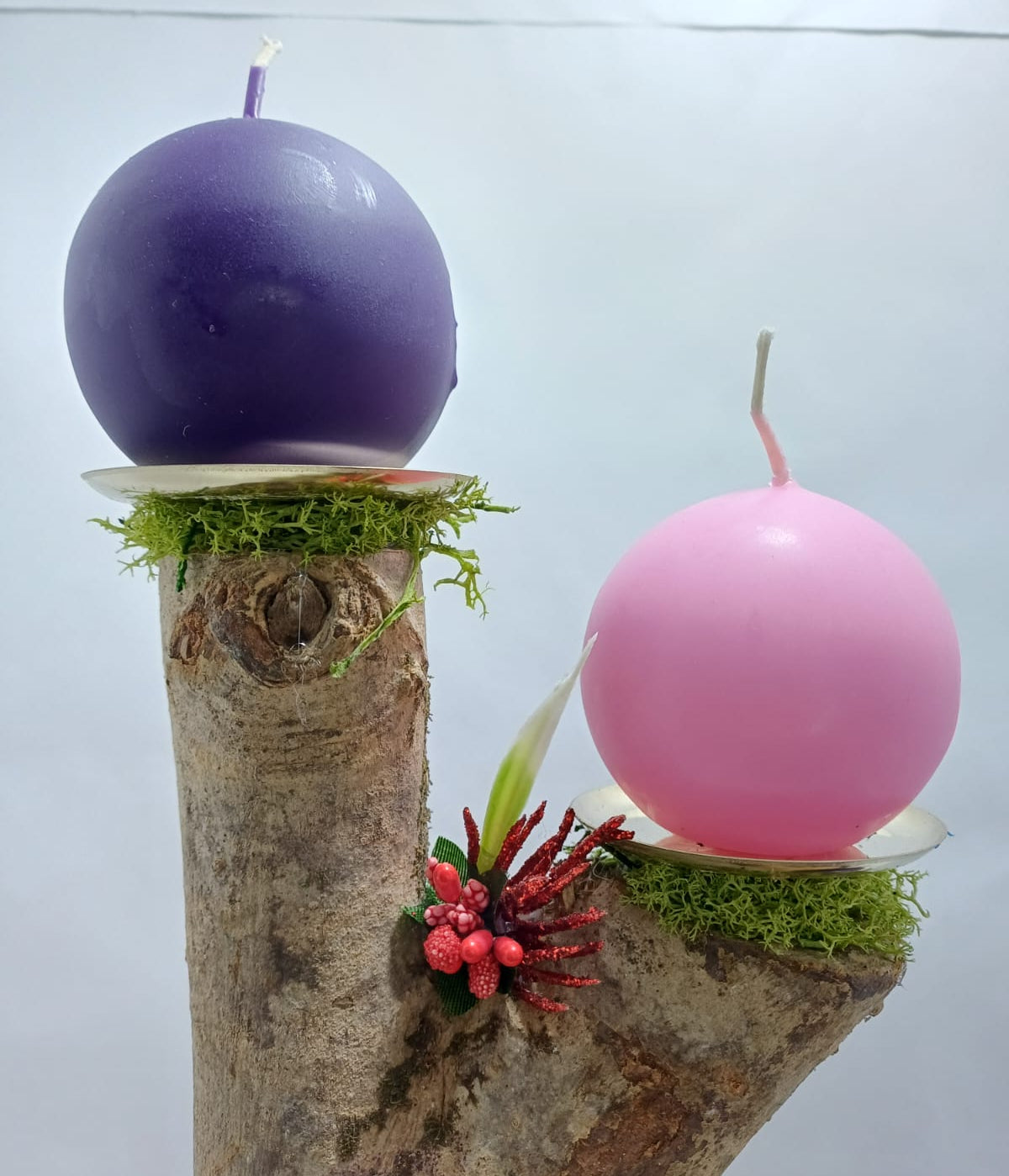 Corona in legno naturale e decori sintetici. Gli alloggi delle candele a sfera colorate sono metallici di color oro in modo da prevenire colatura di cera e inneschi di fiamma. Viene fornito con una proposta di preghiera su cartoncino da recitare in famiglia per le domenica d'Avvento. Articolo da regalo ideale anche come centro tavola.