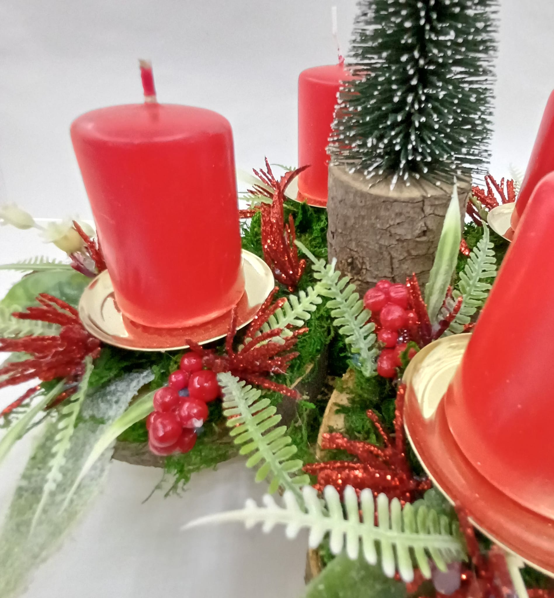 Corona in legno naturale e decori sintetici. Gli alloggi dei moccoli di cera sono metallici di color oro in modo da prevenire colatura di cera e inneschi di fiamma. Viene fornita con una proposta di preghiera su cartoncino da recitare in famiglia per le domenica d'Avvento. Articolo da regalo ideale anche come centro tavola.