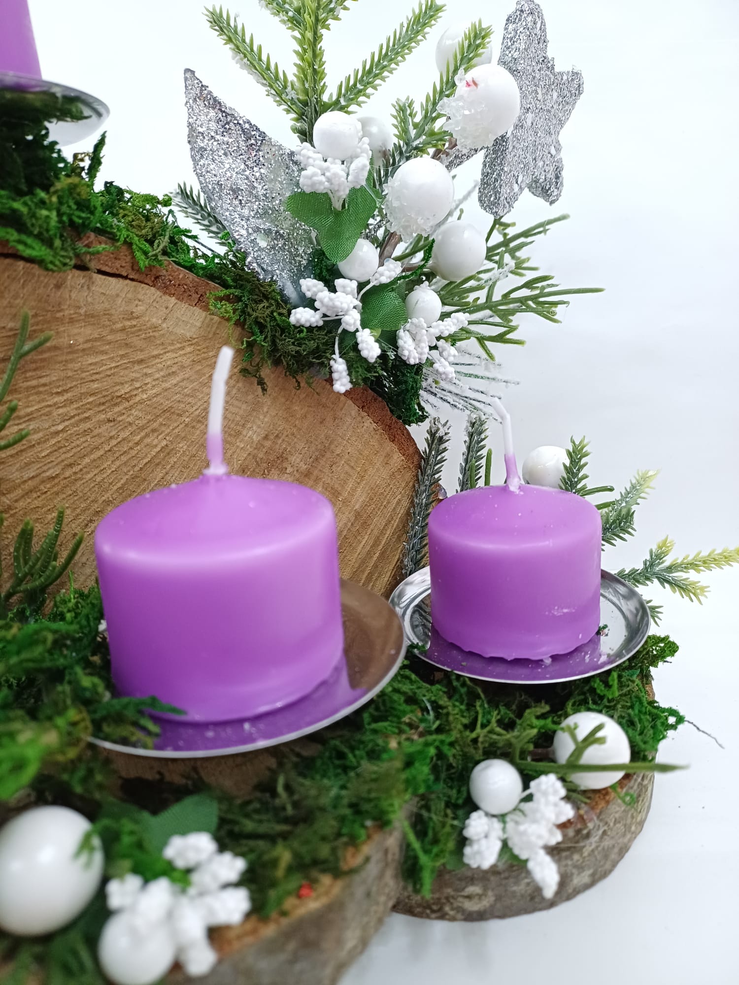 Corona in legno naturale e decori sintetici. Gli alloggi dei moccoli di cera sono metallici di color argento in modo da prevenire colatura di cera e inneschi di fiamma. Viene fornita con una proposta di preghiera su cartoncino da recitare in famiglia per le domeniche d'Avvento. Articolo da regalo ideale anche come centro tavola.