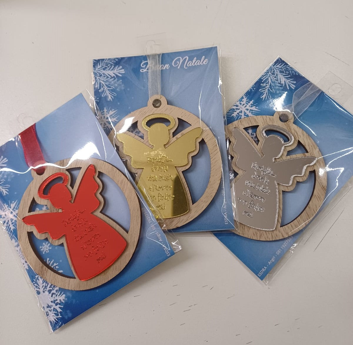 Appendino angelo in plexiglass e legno con frase "Famiglia dove la vita inizia e l'amore non finisce mai". Disponibile in tre varianti di colore: oro, argento e rosso.