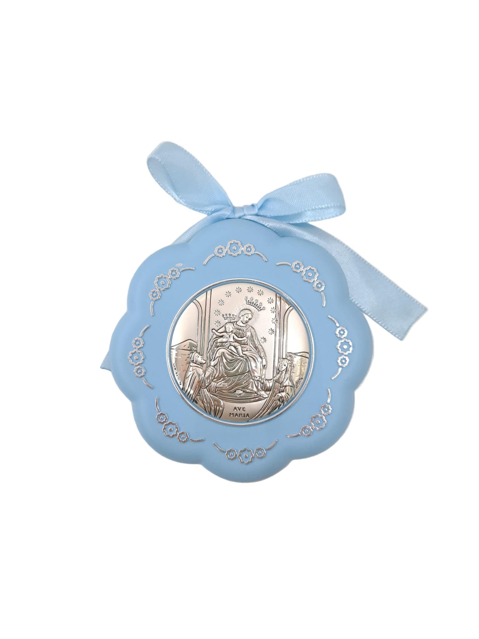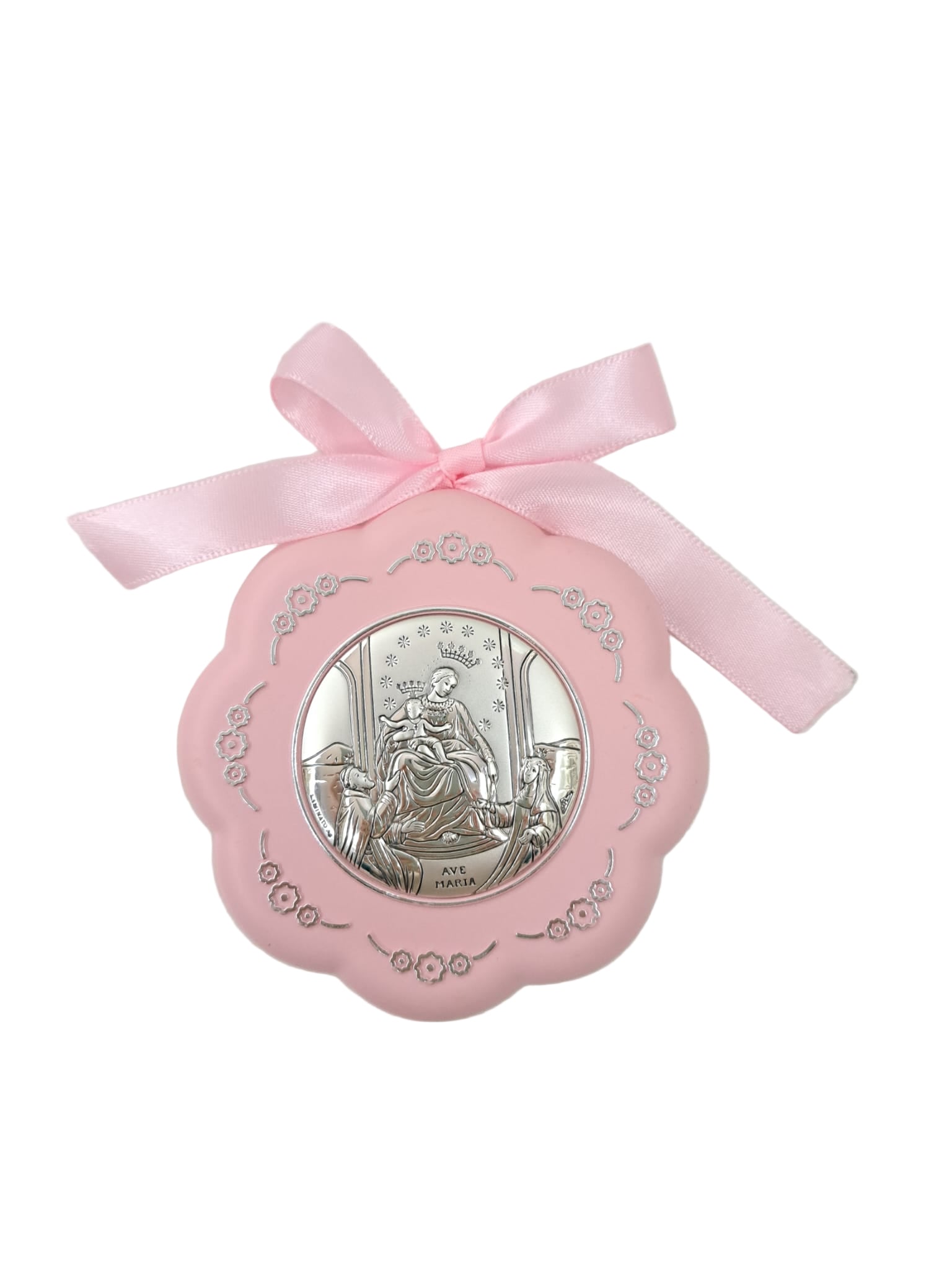 Medaglione con tondo argento laminato da appendere alla culla, al passeggino o nella cameretta del bambino, raffigurante la Madonna di Pompei.