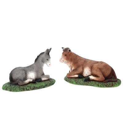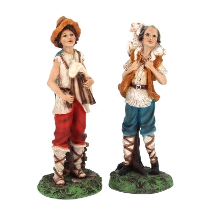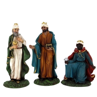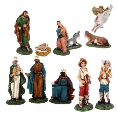 Presepe con Maria, Giuseppe, Gesù, culla, bue, asinello, re magi, angelo, pastore e zampognaro in resina dipinta a mano, con colori acrilici e ad olio