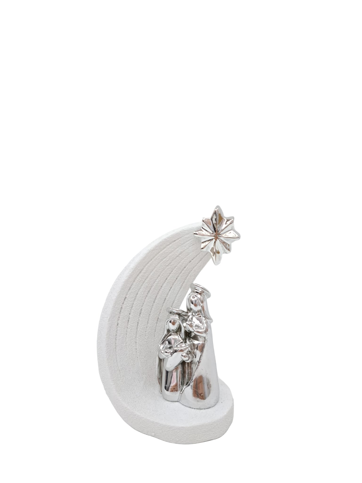 Natività stilizzata argentata con stella cometa argentata e coda in resina bianca sullo sfondo