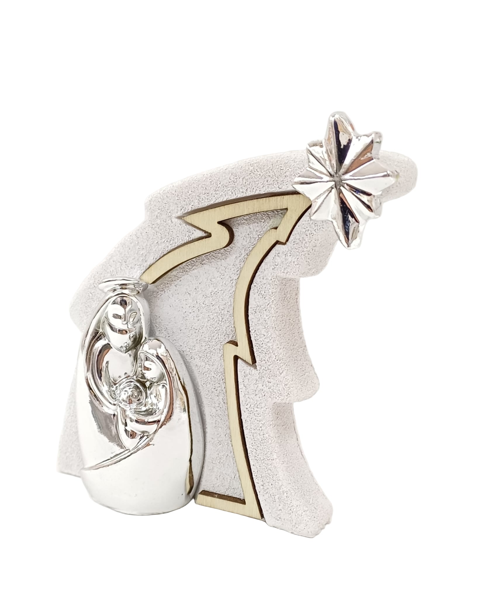 Natività stilizzata argentata con stella cometa argentata albero natalizio in resina bianca ed inserto in legno