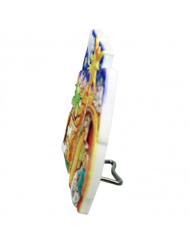 Quadretto natalizio sagomato in resina dipinta , con natività stilizzata e sfondo della città di Gerusalemme, da poggio o da muro