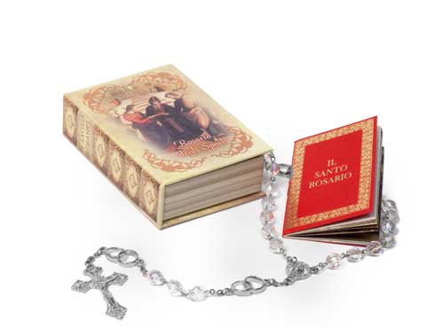 - Confezionato in elegante scatola a libro con illustrazione dello sposalizio dei Santi Sposi, completo di libretto per recitare il santo rosario