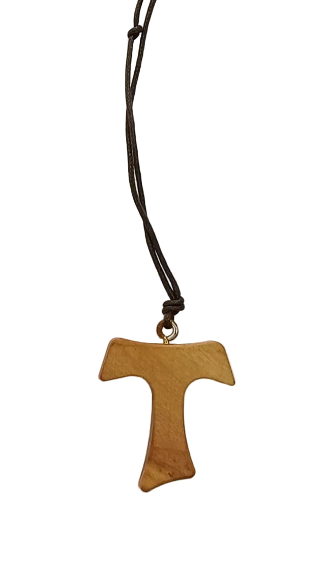 Tau in legno d'ulivo con cordoncino marrone.