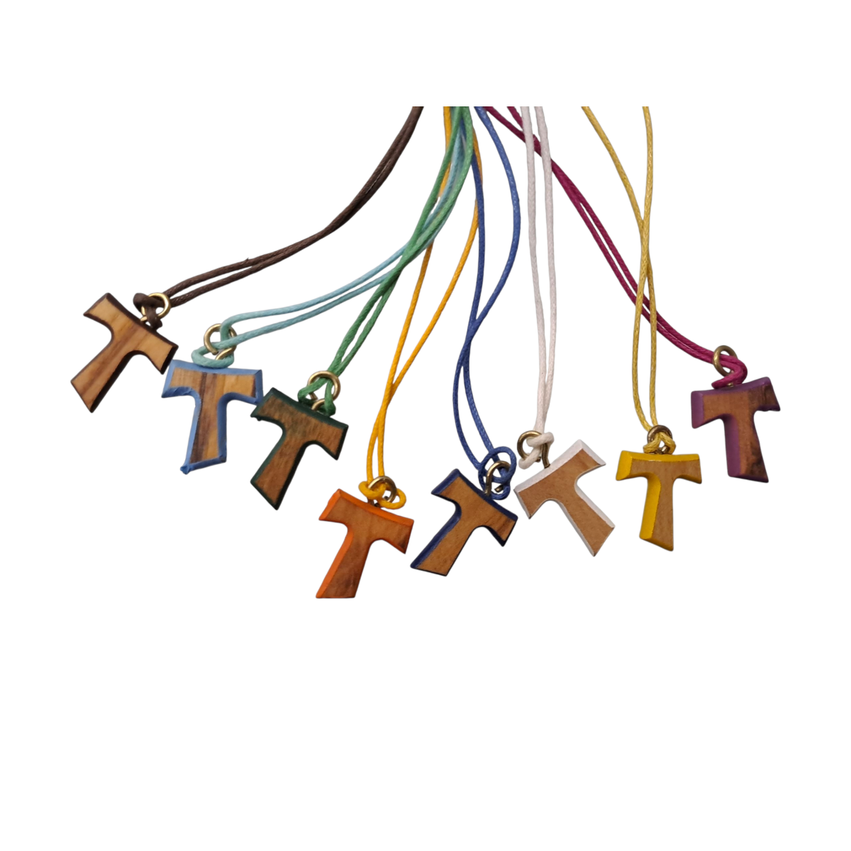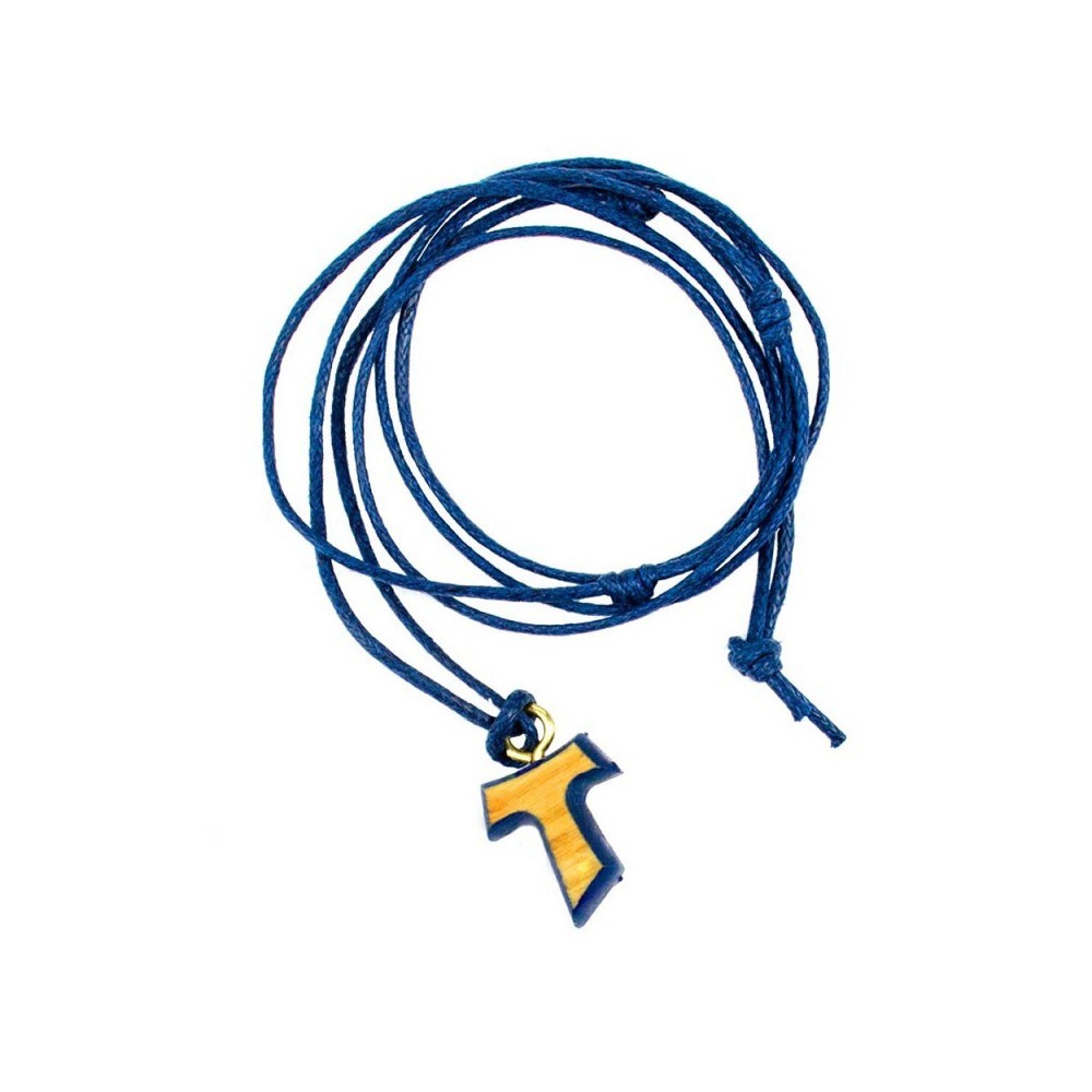 Tau in legno di ulivo con bordi di vari colori completo di collana in corda colorata. Ideale come regalo e come ricordino per i sacramenti della Comunione, Cresima e Confessione.