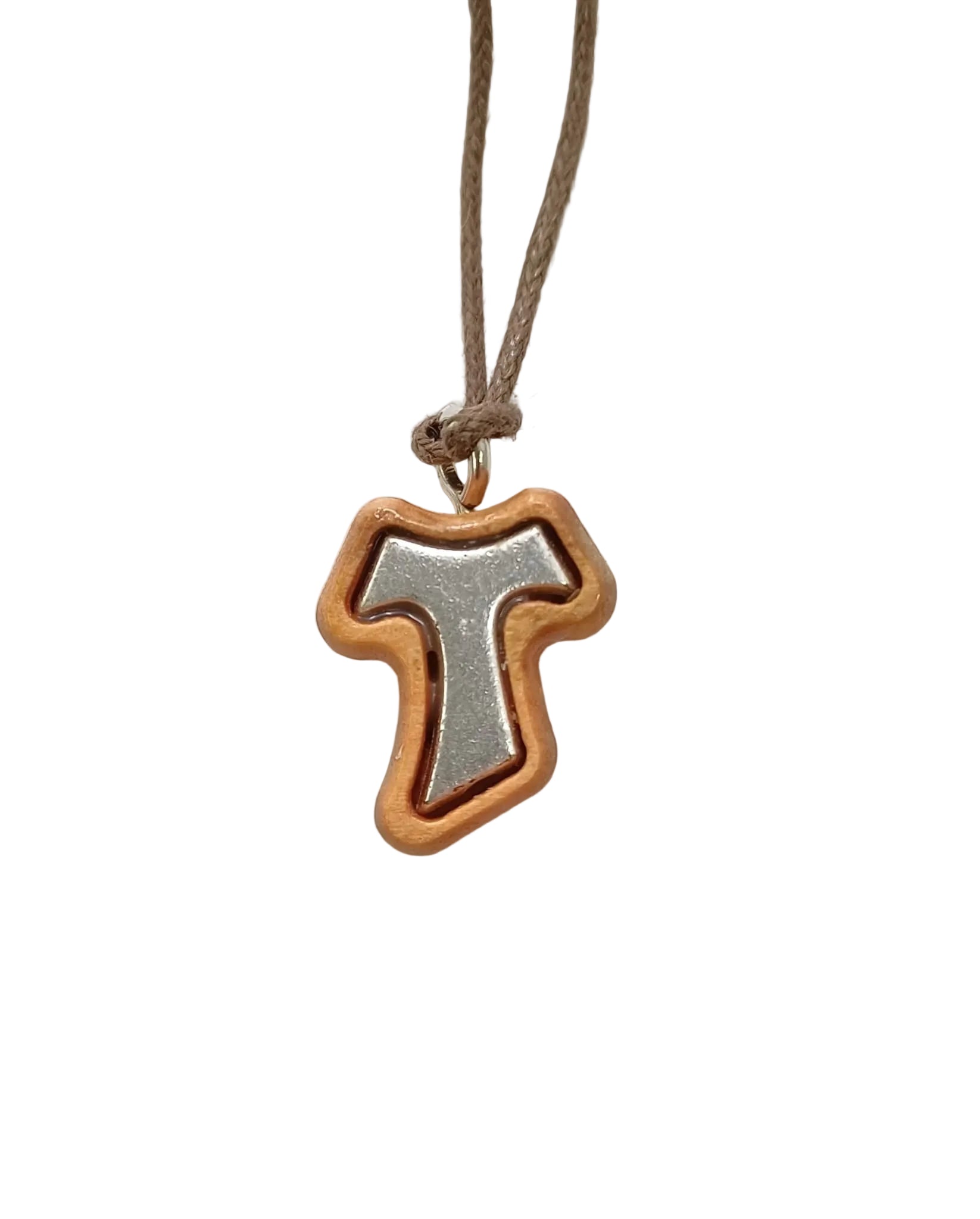 Tau in legno di ulivo con inserto in metallo color argento e laccetto di colore marrone.